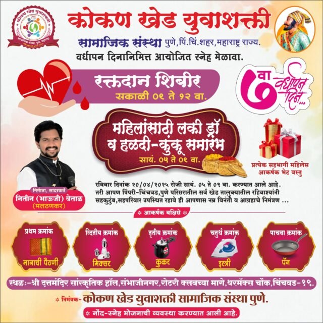 पिंपरी – सामाजिक बांधिलकीचा आदर्श निर्माण करणारी कोकण खेड युवाशक्ती सामाजिक संस्था आपल्या सातव्या वर्धापन दिनानिमित्त एक प्रेरणादायी उपक्रम घेऊन येत आहे. रविवार, दिनांक 20 एप्रिल 2025 रोजी संस्था एक भव्य रक्तदान शिबीर, हळदीकुंकू, लकी ड्रॉ आणि सांस्कृतिक कार्यक्रम यांचे आयोजन करणार असून या कार्यक्रमात हजारो कोकणवासीय सहभागी होणार आहेत.