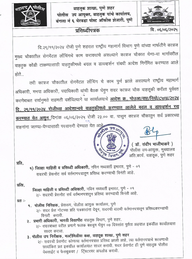 पुणे – कात्रज चौकात सुरू असलेले सेगमेंटल लाँचिंगचे काम पूर्ण झाल्यामुळे, आता सर्व प्रकारच्या वाहनांसाठी कात्रज चौक पुन्हा खुला करण्यात आला आहे. वाहतूक शाखेचे पोलीस उप आयुक्त डॉ. संदीप भाजीभाकरे यांनी यासंदर्भात अधिकृत प्रेसनोट प्रसिद्ध केली आहे.