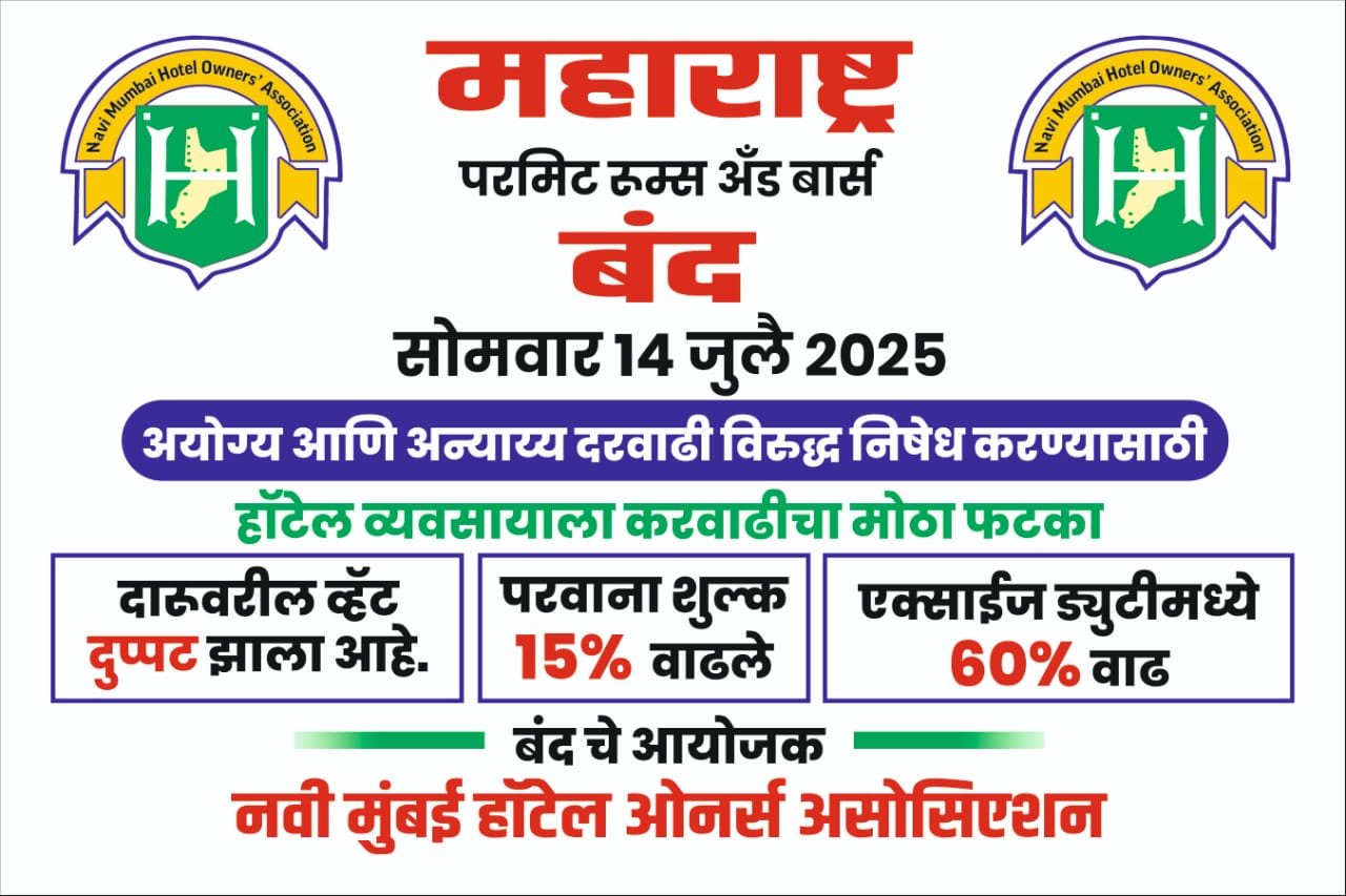 या निषेधार्थ सोमवार, 14 जुलै 2025 रोजी नवी मुंबईतील हॉटेल्स, परमिट रूम्स आणि बार्स बंद ठेवण्याचा निर्णय घेण्यात आला आहे.