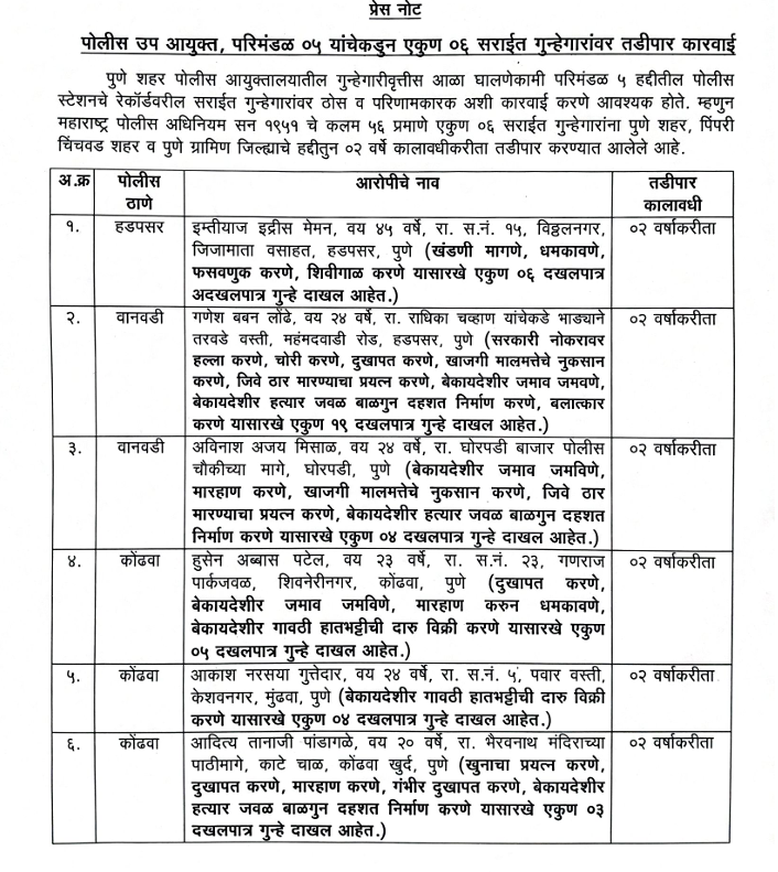 पुणे : पुणे शहरात गुन्हेगारी प्रवृत्तीवर लगाम घालण्यासाठी पोलिसांनी आता आक्रमक धोरण स्वीकारले आहे. याचाच एक भाग म्हणून पोलीस उप आयुक्त डॉ. राजकुमार शिंदे (परिमंडळ ५) यांच्या मार्गदर्शनाखाली ६ सराईत गुन्हेगारांना महाराष्ट्र पोलीस अधिनियम १९५१ चे कलम ५६ अन्वये दोन वर्षांसाठी पुणे शहर, पिंपरी चिंचवड व पुणे ग्रामीण हद्दीतून तडीपार करण्यात आले आहे.