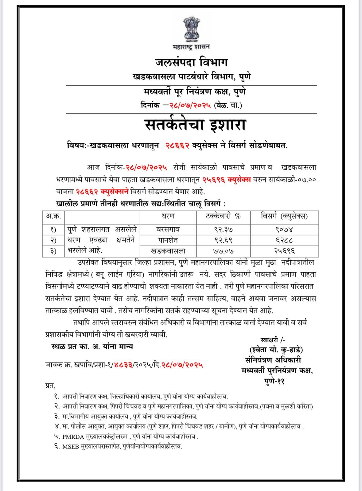 पुणे जिल्ह्यात मुसळधार पावसाच्या पार्श्वभूमीवर खडकवासला पाटबंधारे विभागाने धोक्याचा इशारा दिला आहे. आज, दिनांक २८ जुलै २०२५ रोजी सायंकाळी ७ वाजता खडकवासला धरणातून विसर्ग वाढवून २५,६९६ क्युसेक्स वरून तब्बल २८,६६२ क्युसेक्स इतक्या वेगाने पाणी सोडण्यात येणार आहे. यामुळे मुळा आणि मुठा नदीपात्रालगत राहणाऱ्या नागरिकांना विशेष सतर्क राहण्याचे आवाहन करण्यात आले आहे.