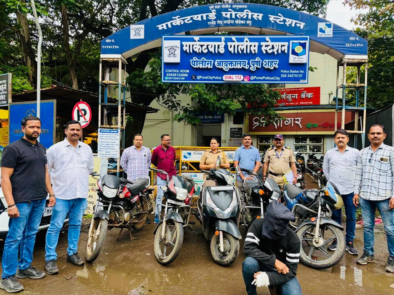 पुणे : पुणे शहरातील मार्केटयार्ड पोलीस स्टेशनच्या तपास पथकाने एक सराईत मोटारसायकल चोरास पकडून तब्बल ₹१,६०,०००/- किंमतीच्या चार मोटारसायकली जप्त करण्यात यश मिळवले आहे. या कारवाईमुळे गणेशोत्सव काळात वाढणाऱ्या वाहनचोरीच्या घटनांवर आळा बसला आहे.