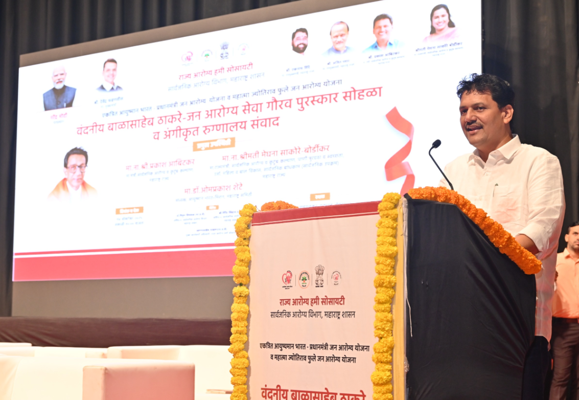 ग. दि. माडगूळकर नाट्यगृह, निगडी येथे राज्य आरोग्य हमी सोसायटी सार्वजनिक आरोग्य विभाग यांच्या संयुक्त विद्यमाने एकत्रित आयुष्मान भारत -प्रधानमंत्री जन आरोग्य योजना व महात्मा ज्योतिराव फुले जन आरोग्य योजना आयोजित वंदनीय बाळासाहेब ठाकरे-जन आरोग्य सेवा गौरव पुरस्कार सोहळा आणि अंगीकृत रुग्णालय संवाद कार्यक्रमात ते बोलत होते. यावेळी खासदार श्रीरंग बारणे, आयुष्यमान भारत मिशन महाराष्ट्र समितीचे अध्यक्ष डॉ.ओमप्रकाश शेटे, सिंधूदुर्ग जिल्हा परिषदेचे मुख्य कार्यकारी अधिकारी रवींद्र खेबुडकर, राज्य आरोग्य हमी सोसायटीचे मुख्य कार्यकारी अधिकारी अण्णासाहेब चव्हाण, उपमुख्य कार्यकारी अधिकारी दयानंद जगताप, पद्मश्री पोपटराव पवार आदी उपस्थित होते.