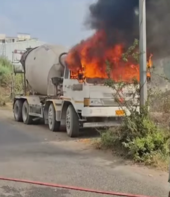 घटना पुण्याच्या वडगाव ब्रिज परिसरात घडली. सिमेंट बल्कर भरधाव वेगाने जात असताना इंजिनमध्ये अचानक शॉर्टसर्किट झाले आणि वाहनाने पेट घेतला. काही क्षणांतच आग पसरली आणि गाडीने धूर सोडायला सुरुवात केली.