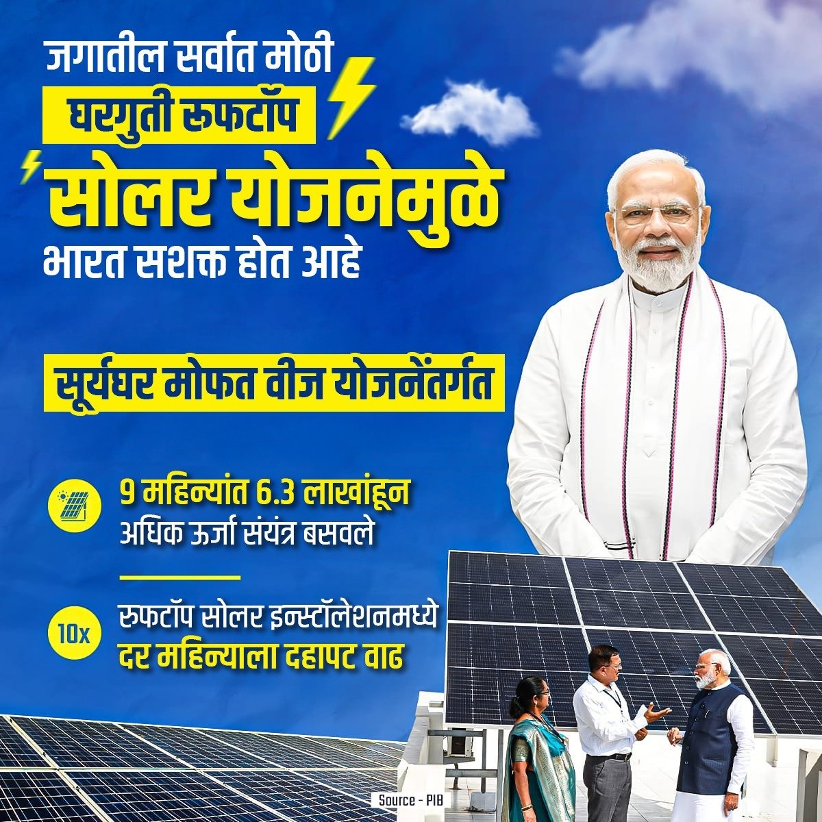 या योजनेअंतर्गत देशभरातील लाखो घरांवर सौर पॅनल्स बसवले जात असून, यामुळे प्रदूषण कमी होण्यासह वीज बचत होईल. योजनेमुळे ग्रामीण भागात मोठ्या प्रमाणावर रोजगार निर्मिती होईल. विशेष म्हणजे, सौर ऊर्जेच्या उत्पादनात भारत जगात आघाडीवर येण्याच्या दिशेने वाटचाल करत आहे.